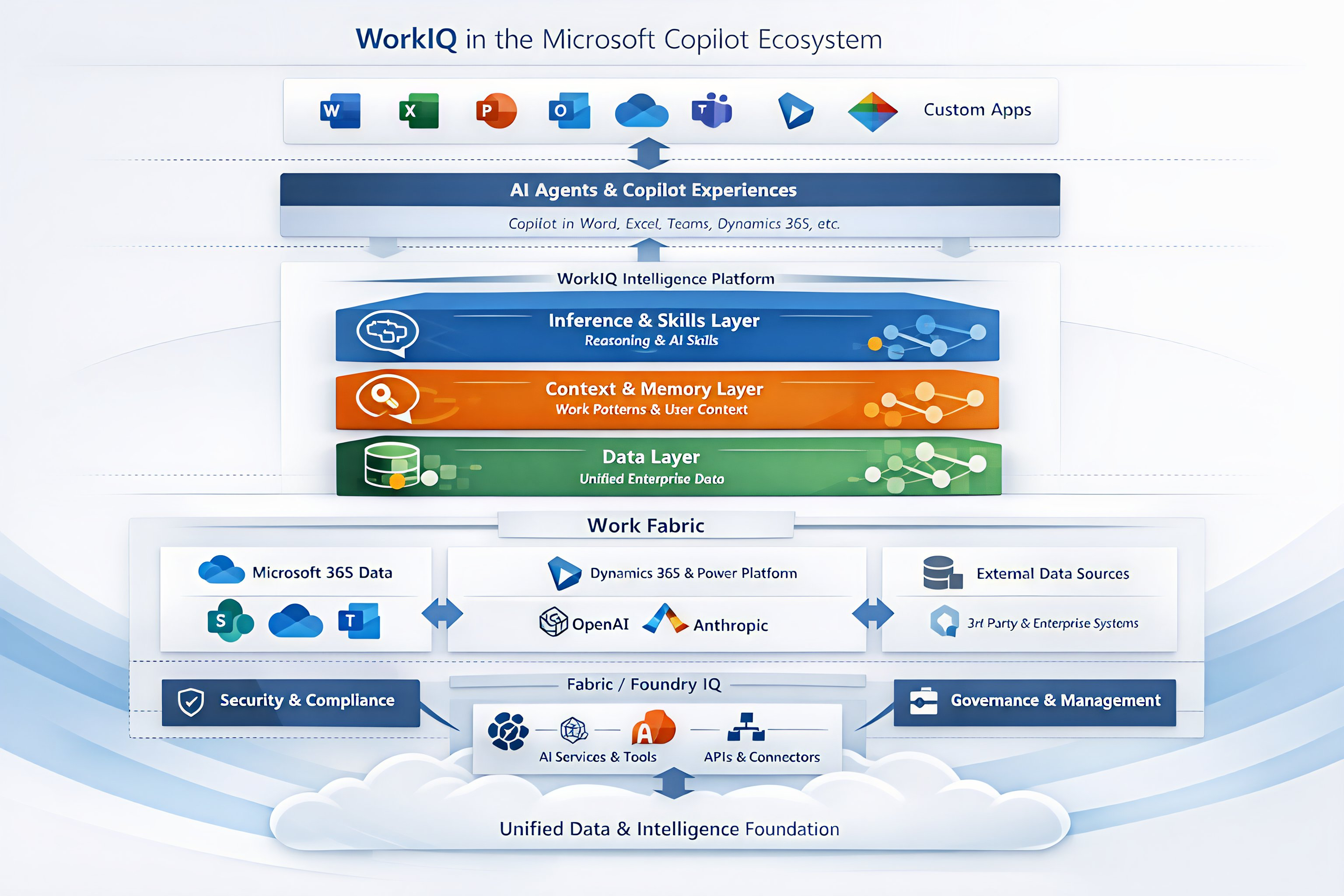 What I see is Microsoft is moving from app specific AI to a platform level intelligence model powered by three layers: • WorkIQ • Work Fabric • Foundry IQ Together, they shift Copilot from reacting to queries understanding organisational context, data relationships, and business processes. This makes agents more intelligent across workflows instead of staying confined to individual apps.